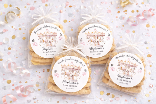 View full detailsAdd a magical touch to your baby shower favors with these elegant personalized carousel stickers! Featuring a soft watercolor carousel with delicat...