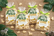 Designed with tropical leaves and gold safari animals, these round labels are perfect for sealing animal cracker bags, snack bags, and party favors for a Wild One first birthday or jungle-themed party.