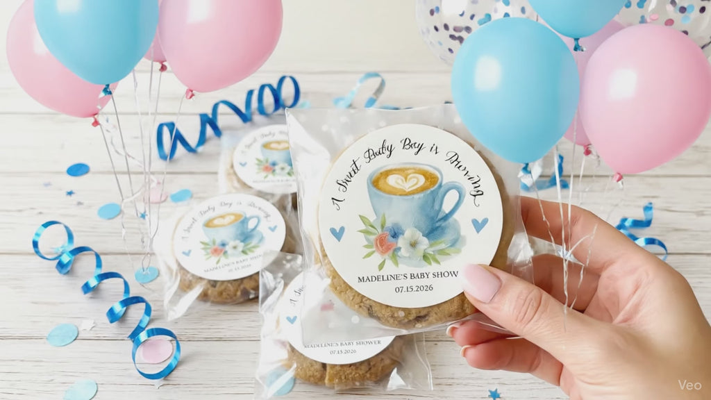 Celebrate your little one with these “A Sweet Baby Boy Is Brewing” baby shower stickers, perfect for coffee-themed baby showers and cozy brunch celebrations. Featuring a soft blue coffee cup with florals and hearts, these stickers add a sweet and stylish touch to your baby shower favors.